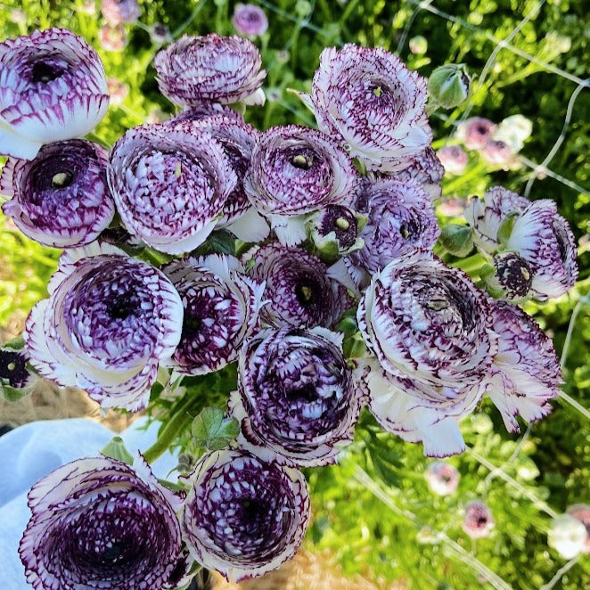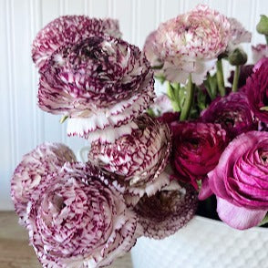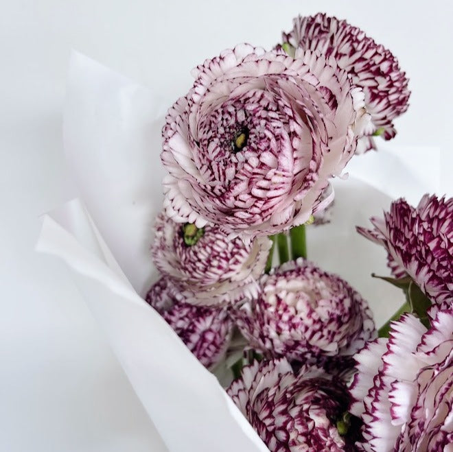Ranunculus Bianco Striato commands attention with its combination of white and burgundy tones.